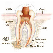 Infection of the pulp can be caused by trauma to the tooth, deep decay, cracks and chips, or repeated dental procedures. Symptoms of the infection can be identified as visible injury or swelling in the cheek or gums, sensitivity to temperature or pain in the tooth and gums.