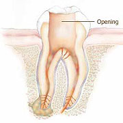 The tooth is anesthetized. An opening is made through the crown of the tooth to the pulp chamber. |
